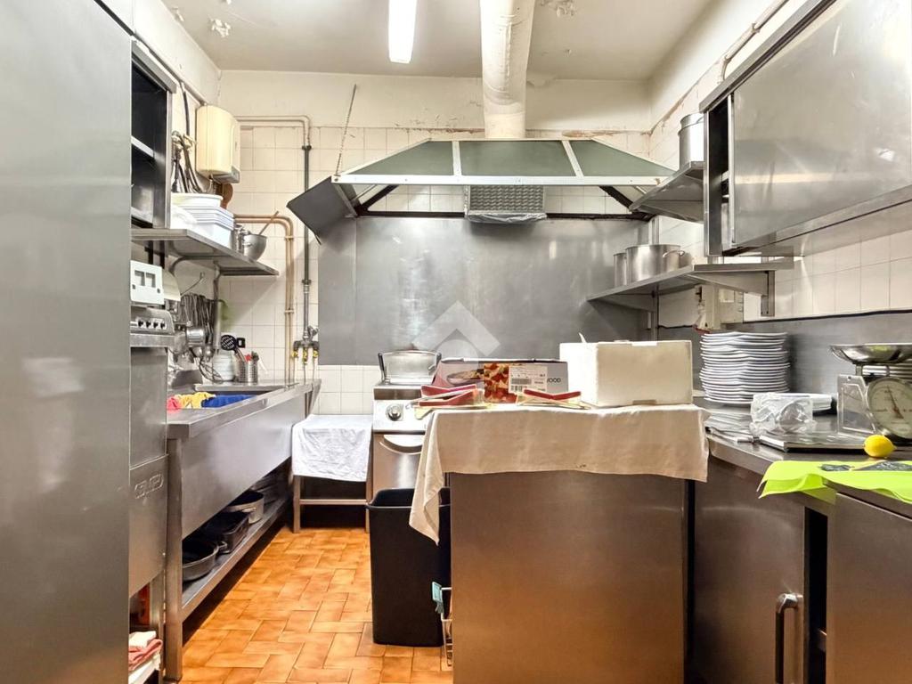 La zona operativa è funzionale e ben organizzata, con cucina, piccolo ripostiglio, bagno per la clientela, stanza spogliatoio per il personale con bagno dedicato, oltre a una cantina con locale adibito a cella frigorifera, elemento essenziale per un’attività di ristorazione strutturata.